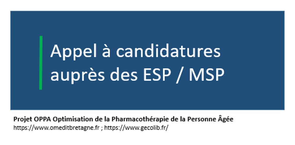 L’OMéDIT Bretagne et GECO Lib’ s’associent pour lancer l’appel à candidatures RCP OPPA sur l’Optimisation de la Pharmacothérapie de la Personne Âgée, auprès des Équipes de Soins Primaires et des Maisons de Santé Pluridisciplinaires, et comprenant :