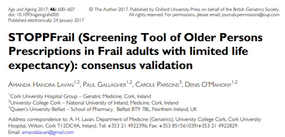 - Hanora et STOPP Frail (Screening Tool of Older Persons Prescriptions in Frail adults with limited life expectancy) : consensus validation. Age and Ageing ; 46: 600–607 (2017). Accessible ici