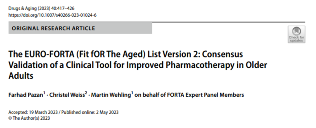 - Pazan, F., Weiss, C., Wehling, M. et al. The EURO-FORTA (Fit fOR The Aged) List Version 2: Consensus Validation of a Clinical Tool for Improved Pharmacotherapy in Older Adults. Drugs Aging 40, 417–426 (2023) : ici (NOUVEAU)
